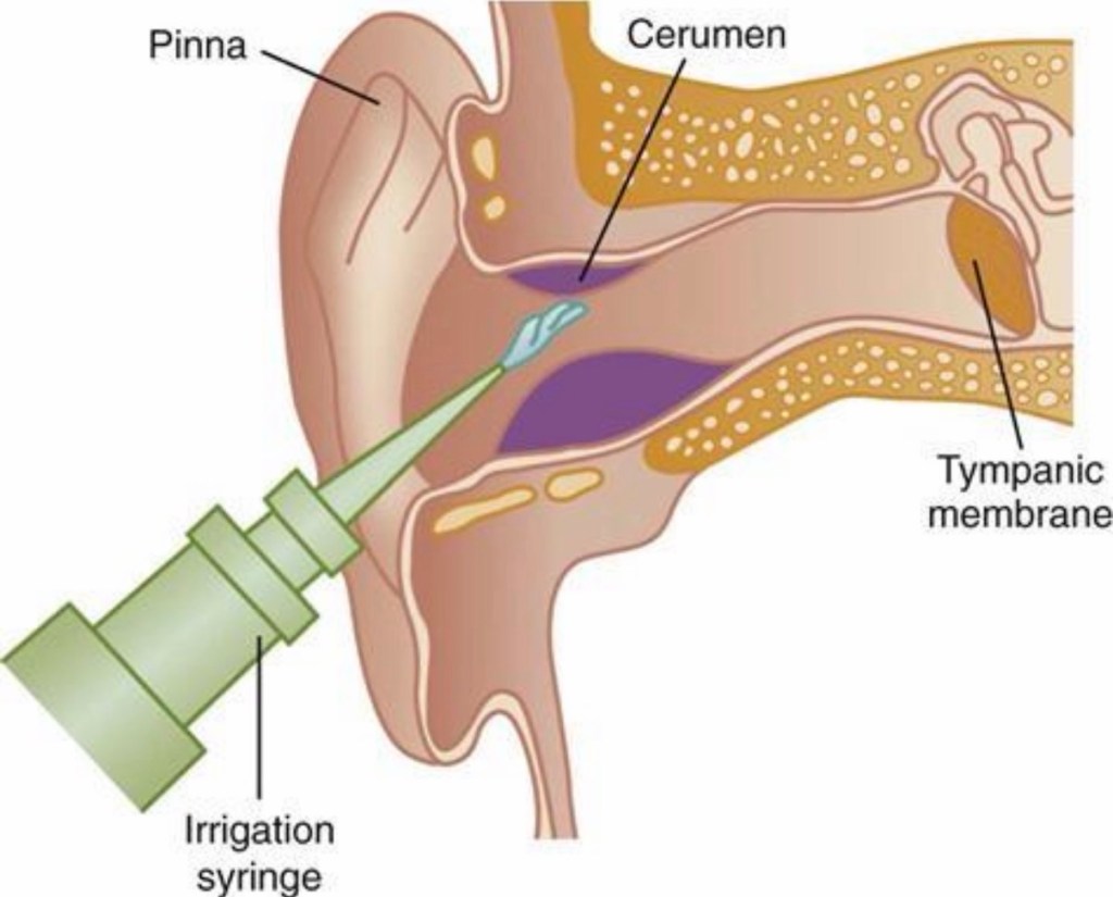 Ear irrigation involves directing a controlled flow of warm water into the ear canal to soften and wash out earwax. The procedure is typically carried out using a specialised irrigation device by a trained professional.